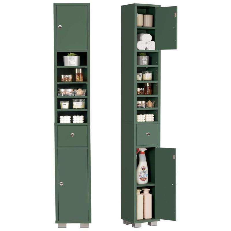 This storage cabinet features five adjustable shelves, allowing you to make room for larger or smaller items. It also has four more shelves located in the top and the bottom cupboards. The drawer in the middle is ideal for items like cosmetics, Band-Aids, and other smaller items that may roll around or fall easily off the shelves. The whole unit is eight inches deep, eight inches wide, and 71 inches tall, fitting items such as tall paper towels, shampoo bottles, lotion bottles, cleaning spray, rolled up towels, and more. It’s perfect for all the little odds and ends that get left on top of the counter or get lost in bigger bathroom cabinets.