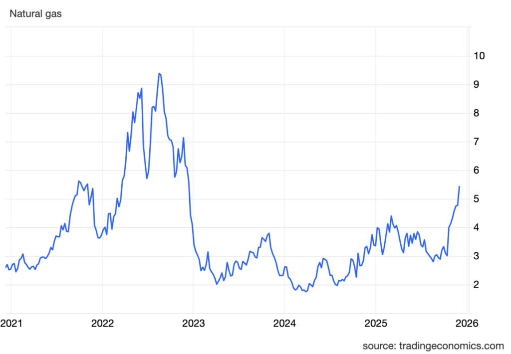 Cold weather, record exports, and the threat of new gas-powered AI data centers of liquefied natural gas are sending the energy commodity soaring. It’s now at a 35 month high.