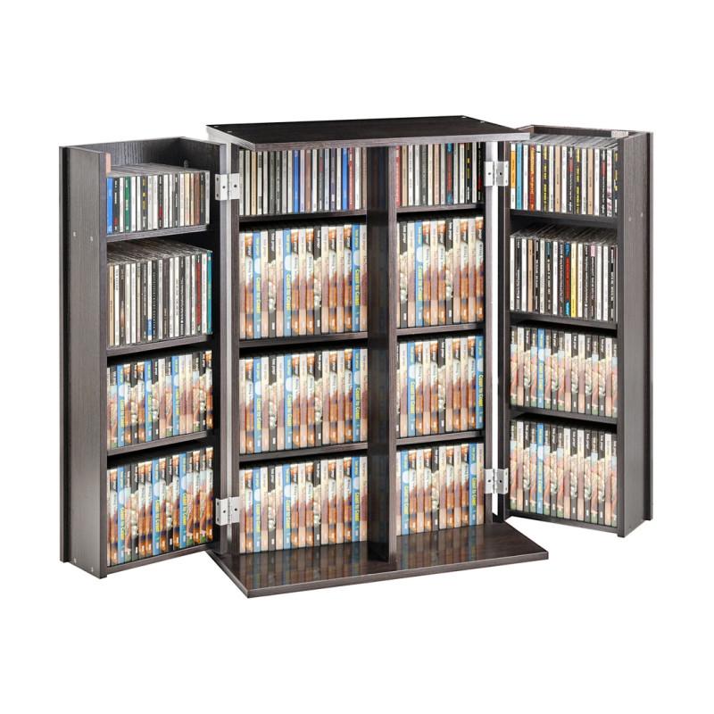 All told, the cabinet can comfortably hold as many as 576 CDs, or roughly 300 DVDs. It weighs just shy of 50 pounds when empty and measures 33.3 inches tall, 24 inches wide, and 14.4 inches deep.